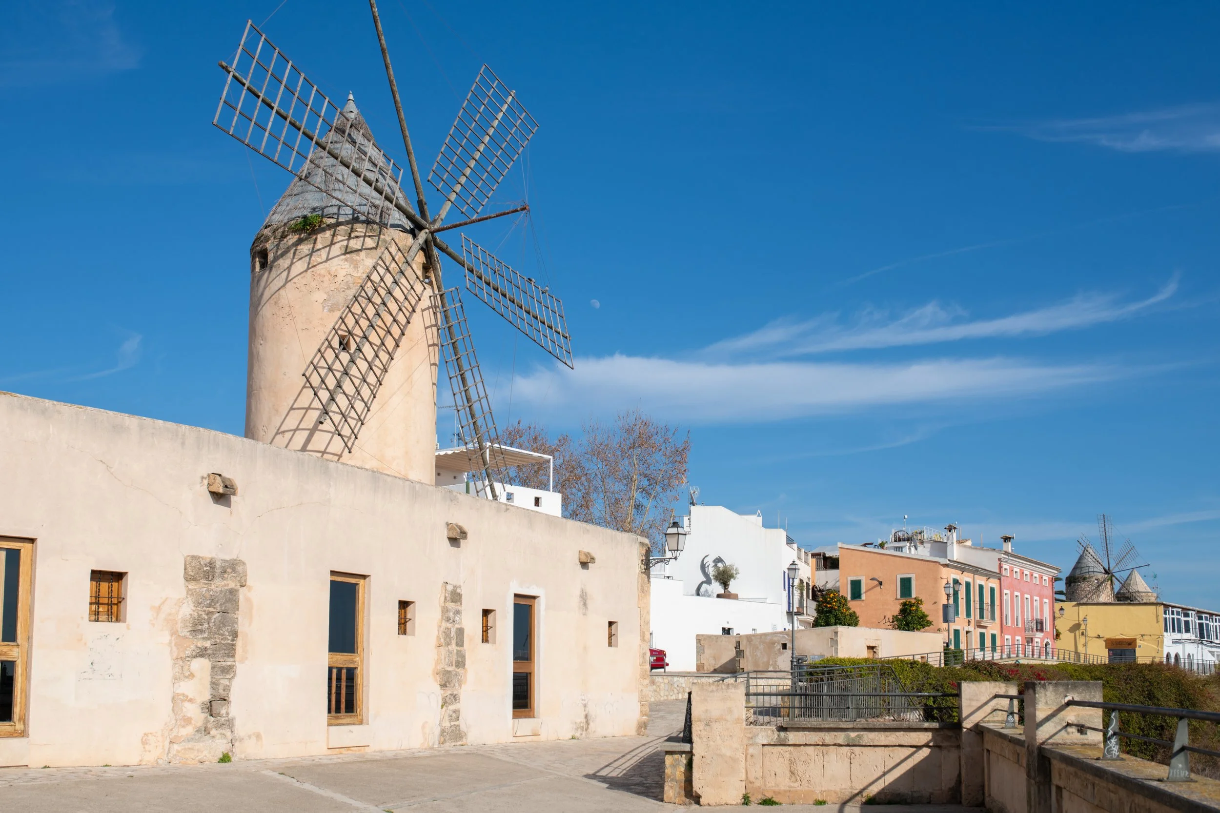The narrow streets of Es Jonquet are lined with historic homes, including many that have been carefully restored. The iconic windmills stand as a testament to the neighborhood's past, creating a picturesque scene that attracts both residents and visitors.